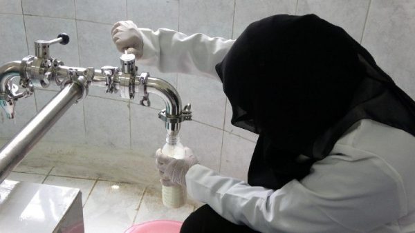 من جانبها أكدت مديرة مركز خيرات، سلمى الأشموري أهمية تدشين المشروع الذي تتراوح قدرته الإنتاجية بين 300 – 700 لتر من الحليب الطازج يومياً .. مشيرة إلى أنه يتم بسترة وتعبئة الألبان الطازجة القادمة من مزارع محافظة ذمار بطريقة صحية على أيدي خبرات في هذا المجال .