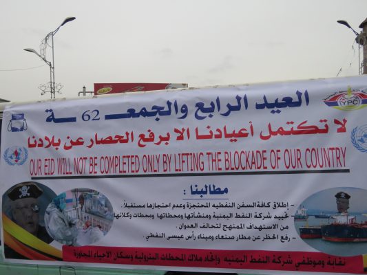 وشجبت بيانات صادرة عن منظمات المجتمع المدني والاتحاد العام لنقابات عمال اليمن والاتحاد العام لملاك المحطات البترولية الأهلية، استمرار تحالف العدوان في احتجاز سفن المشتقات النفطية وعدم السماح لها بالدخول رغم حصولها على تصاريح من الأمم المتحدة.