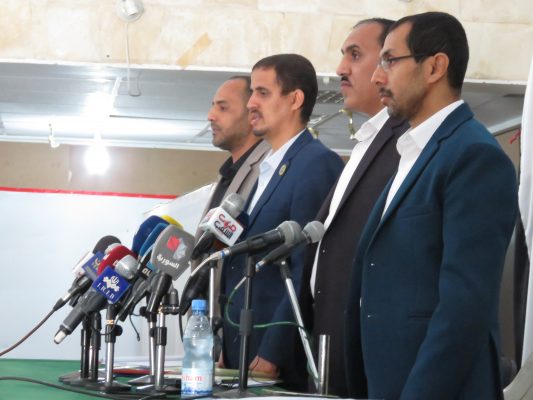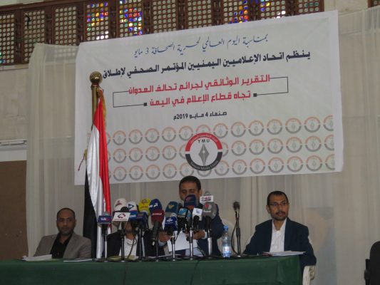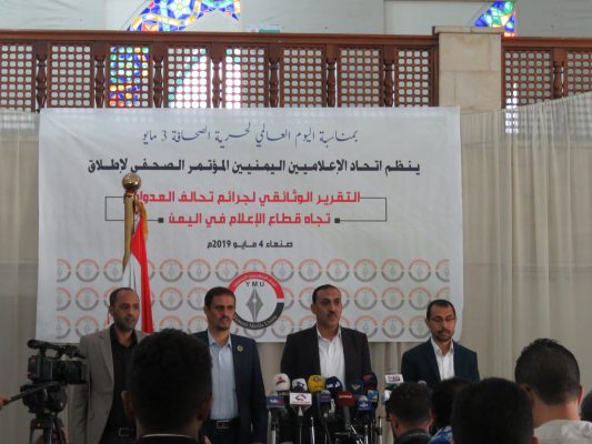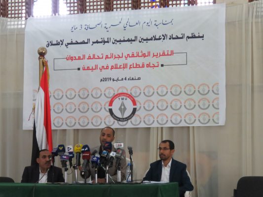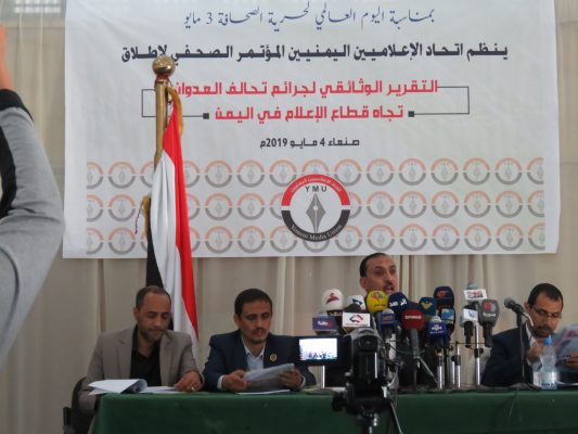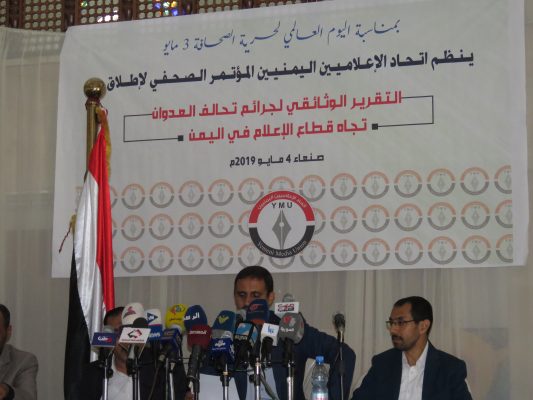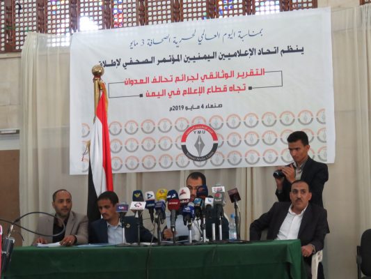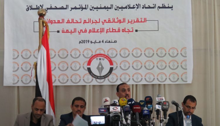 عرض اتحاد الإعلاميين اليمنيين، اليوم السبت، خلال مؤتمر صحفي عقده بالعاصمة صنعاء انتهاكات دول العدوان السعودي الأمريكي بحق الإعلاميين ووسائل الإعلام الوطنية خلال أربع سنوات من العدوان على اليمن.