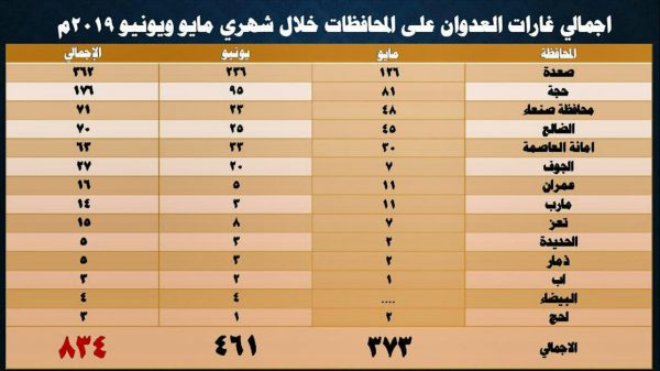 وأوضح العميد سريع أن طيران العدوان الأمريكي السعودي الإماراتي الغاشم شن 834 غارة على مختلف محافظات الجمهورية خلال شهري مايو ويونيو المنصرمين، أدت إلى استشهاد وجرح العشرات من المواطنين جلهم أطفال ونساء.