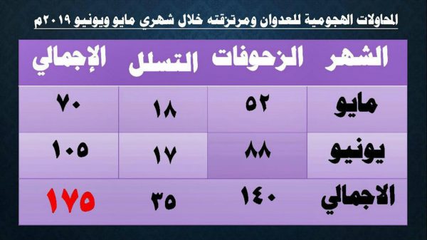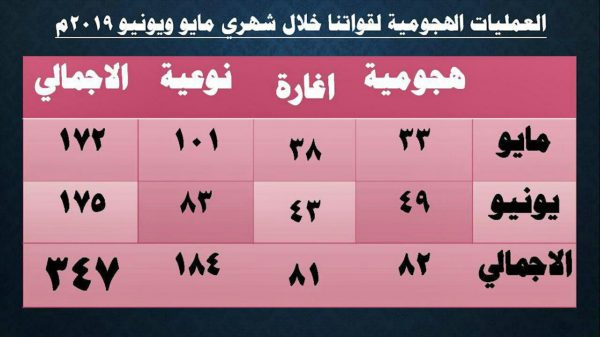 وحول الموقف القتالي والعملياتي .. أكد العميد سريع أن القوات المسلحة واللجان الشعبية نفذت أكثر من 347 عملية عسكرية هجومية على مواقع العدو خلال مايو ويونيو، كما تصدت وأفشلت 175 عملية هجومية للعدوان خلال مايو ويونيو منها 70 عملية خلال شهر مايو و105 عمليات خلال شهر يونيو المنصرم.