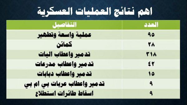 وذكر أن إجمالي عمليات سلاح الجو المسير بلغت خلال الشهرين الماضيين 36 عملية منها 15 عملية بالاشتراك مع المدفعية.. مبيناً أن 21 عملية لسلاح الجو المسير استهدفت منشآت عسكرية سعودية او تستخدم لأغراض عسكرية خلال الشهرين الماضيين، و10 عمليات على مطار ابها، و7 عمليات على مطار جيزان، و3 عمليات على مطار نجران، وعملية على قاعدة خميس مشيط خلال الفترة عينها.