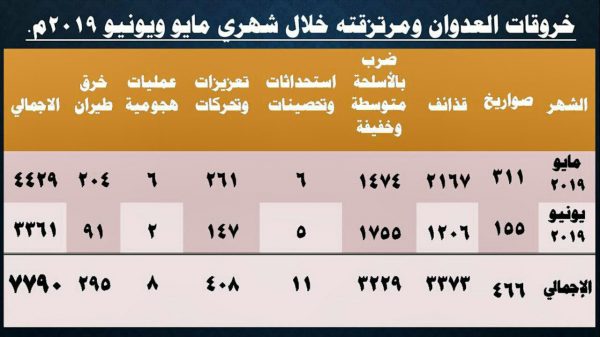 وأشار إلى أن قوى العدوان ارتكبت 7790 خرقا لوقف إطلاق النار في الحديدة، منها 4429 خرقا خلال شهر مايو، و 3361 خرقا خلال شهر يونيو، ليبلغ إجمالي خروقات العدوان ومرتزقته في الحديدة منذ وقف إطلاق النار في 18 ديسمبر 2018م 27714 خرقا.