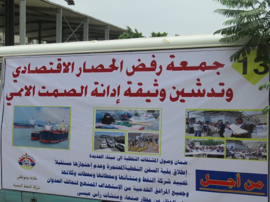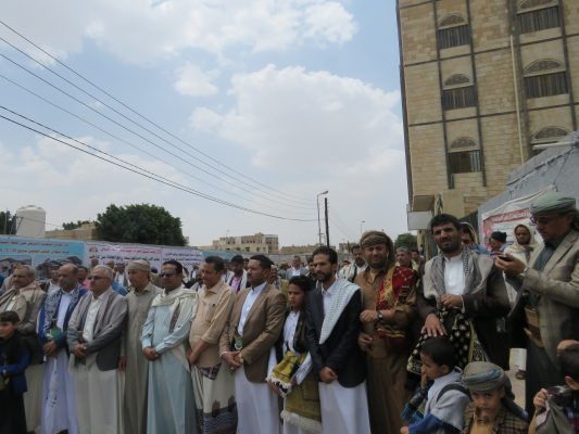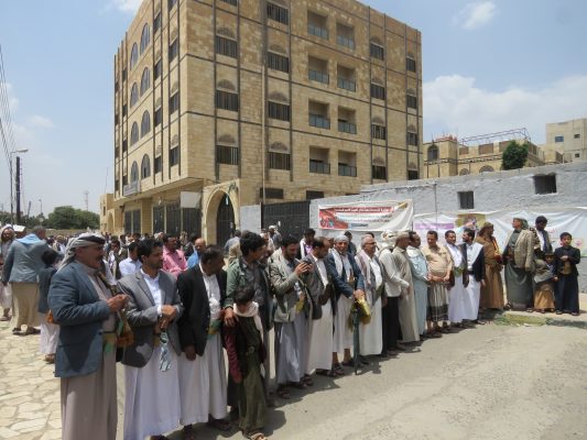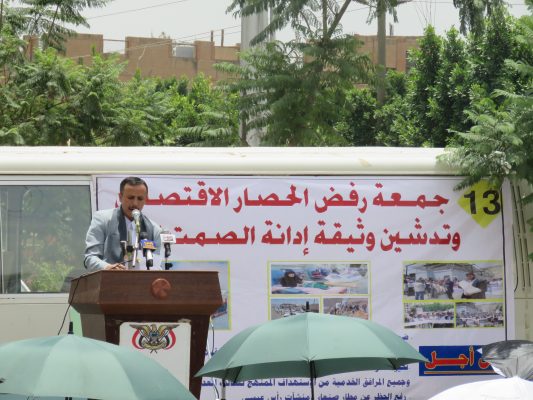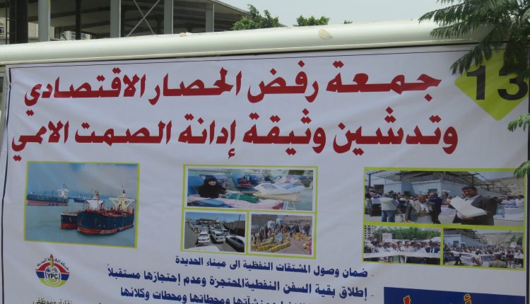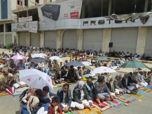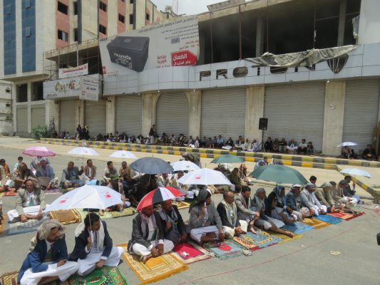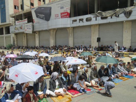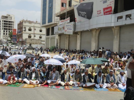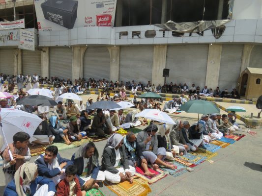أدى موظفو شركة النفط اليمنية والنقابات والهيئات التابعة لها اليوم صلاة الجمعة ال13 امام مكتب الامم المتحدة بالعاصمة صنعاء رفضاً للحصار الاقتصادي وقرارات حكومة هادي ولجنة عدن الاقتصادية بحصر استيراد المشتقات على مصافي عدن المؤجرة للعيسي .