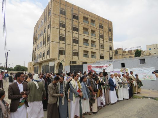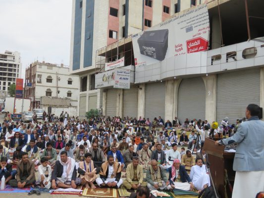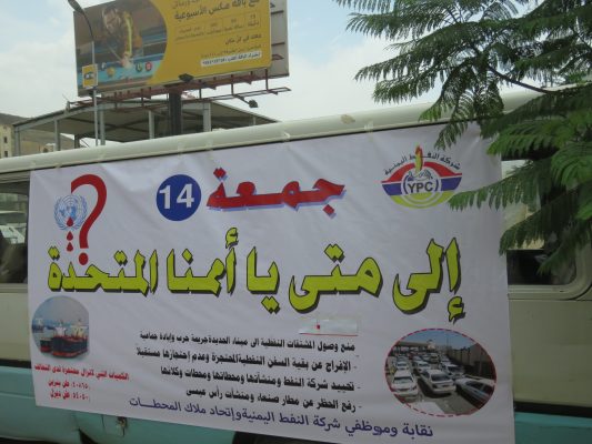 جدد موظفو شركة النفط اليمنية والنقابات والهيئات التابعة لها المعتصمين للجمعة ال14 على التوالي أمام مكتب الأمم المتحدة بصنعاء مطالبتهم للأمم المتحدة بإطلاق كافة سفن المشتقات النفطية التي يحتجزها تحالف العدوان و من تسمي نفسها باللجنة الاقتصادية “عدن” .
