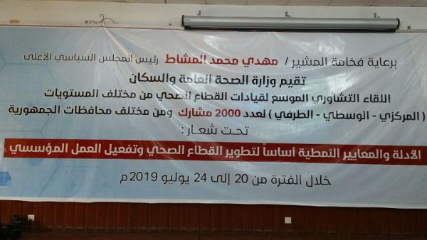 ويعقد اللقاء برعاية رئيس المجلس السياسي الأعلى المشير مهدي المشاط، تحت شعار “الأدلة والمعايير النمطية أساسا لتطوير القطاع الصحي وتفعيل العمل المؤسسي” ولعدد 2000 مشارك وسيستمر حتى 24 من شهر يوليو الحالي.