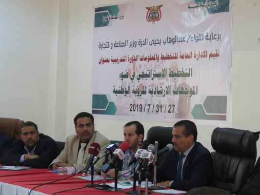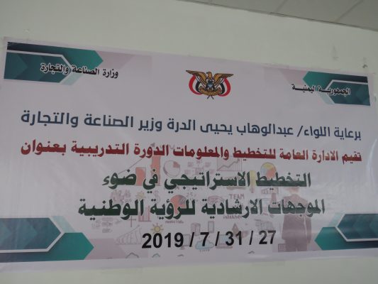 وتهدف الدورة على مدى 6 أيام إلى رفد 45 من موظفي وكوادر الوزارة في مختلف القطاعات والإدارات بوزارة الصناعة والتجارة بمهارات ومعارف حول التخطيط والتحليل الاستراتيجي وآليات إعداد خطط الوزارة وبرامج تنفيذها وتحديد المسئوليات والاختصاصات في التنفيذ وفقاً لموجهات الرؤية الوطنية لبناء الدولة.