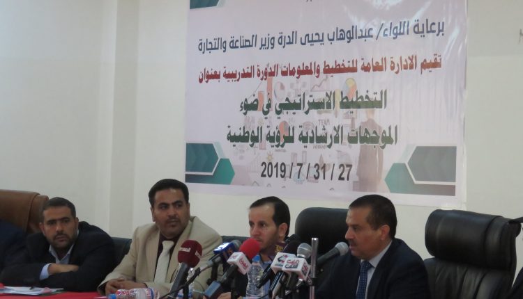 وتهدف الدورة على مدى 6 أيام إلى رفد 45 من موظفي وكوادر الوزارة في مختلف القطاعات والإدارات بوزارة الصناعة والتجارة بمهارات ومعارف حول التخطيط والتحليل الاستراتيجي وآليات إعداد خطط الوزارة وبرامج تنفيذها وتحديد المسئوليات والاختصاصات في التنفيذ وفقاً لموجهات الرؤية الوطنية لبناء الدولة.