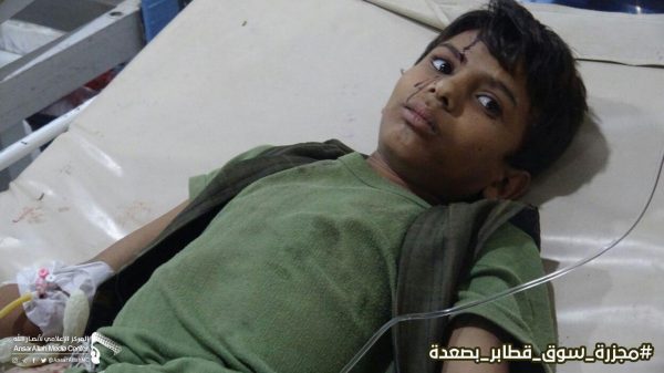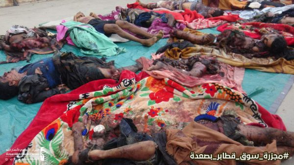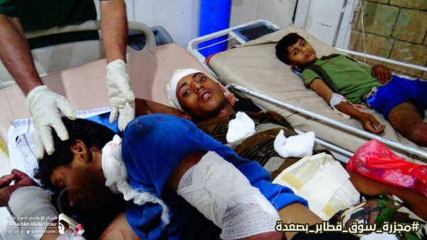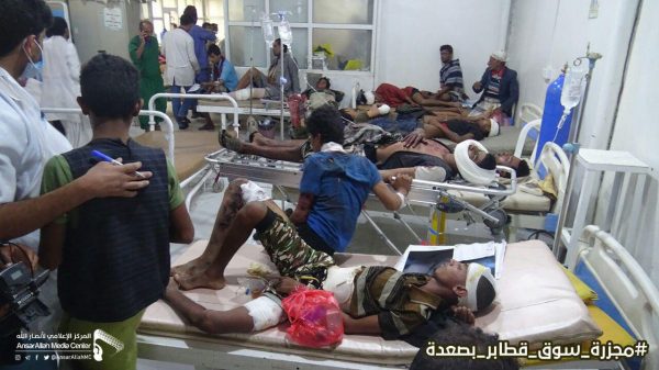 المصادر أكدت أن قوى العدوان استهدفت سوق آل ثابت الشعبي في مديرية قطابر الحدودية بالعديد من قذائف المدفعية أدت إلى استشهاد ثلاثة عشر مواطنا بينهم طفلان كحصيلة أولية وإصابة 23 آخرين بينهم أطفال.