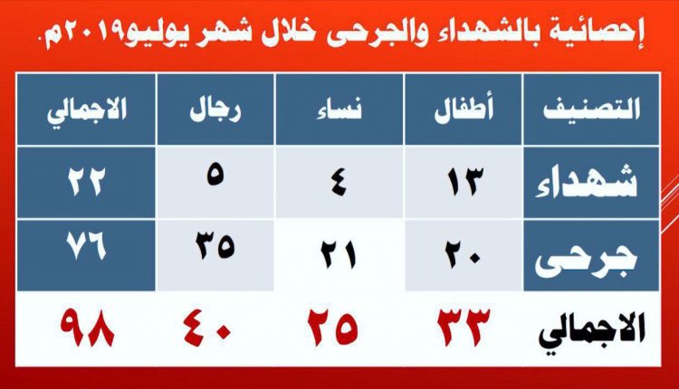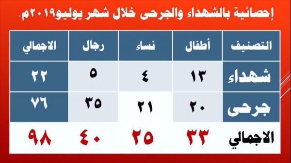 وأكد أن عدد الشهداء والجرحى بلغ خلال شهر يوليو المنصرم 98 شهيدا وجريحا ، بينهم 33 طفلا و 25 امرأة وأن عدد الشهداء من الأطفال 13 شهيد ومن النساء 21 شهيدة.