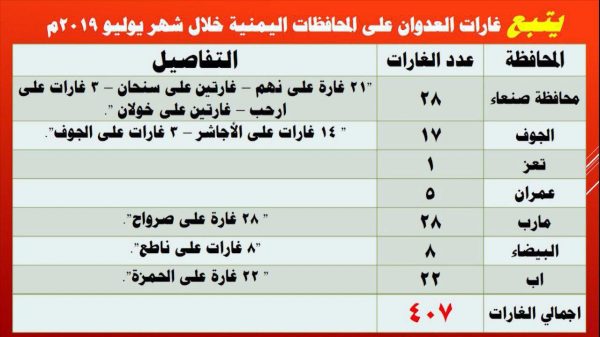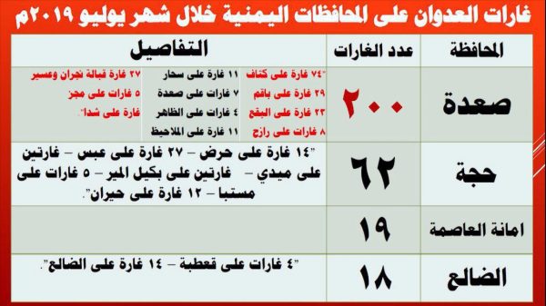 وأشار إلى أن  تحالف العدوان استمر في ارتكاب المجازر واستهداف المدن والقرى اليمنية من خلال الغارات الجوية وكذلك القصف المدفعي والصاروخي والحصار الشامل، لافتا إلى أن المحافظات اليمنية تعرضت خلال شهر يوليو لأكثر من 407 غارة وأن النصيب الأكبر من هذه الغارات شُنت على محافظة صعدة بأكثر من 200غارة ثم محافظة حجة بأكثر من 62 غارة إضافة إلى محافظات صنعاء والضالع وأمانة العاصمة والجوف وتعز وعمران ومأرب والبيضاء.