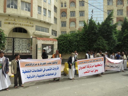 أقيمت أمام وزارة النفط والمعادن بصنعاء اليوم وقفة احتجاجية للتنديد برفع العدوان ومرتزقته سعر الغاز المنزلي تحت شعار ” رفع أسعار الغاز، نهب لمواردنا وتجويع لأطفالنا”.
