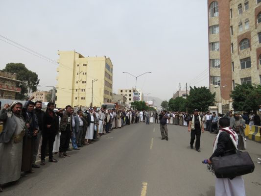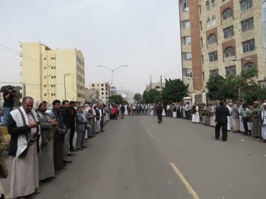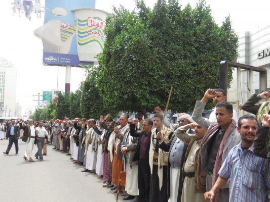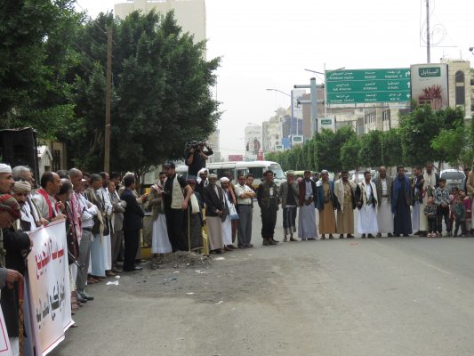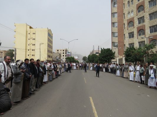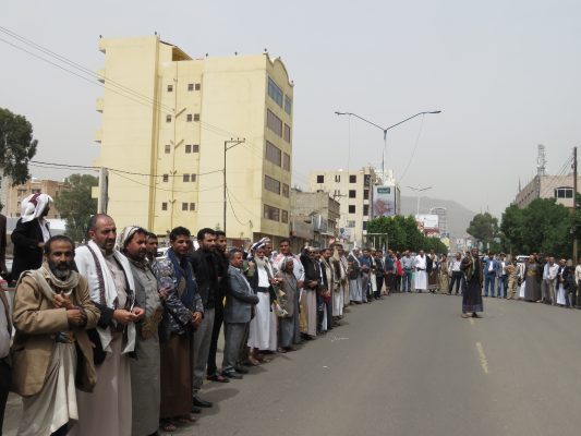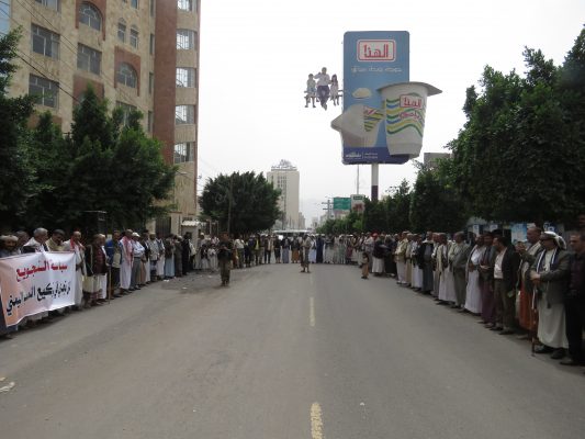 وطالب المشاركون في الوقفة، الأمم المتحدة والمنظمات الدولية والدول الأعضاء في مجلس الأمن والمجتمع الدولي، بتحمل المسؤولية وإلزام دول العدوان بوقف حربها العسكرية والاقتصادية على الشعب اليمني.