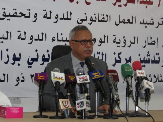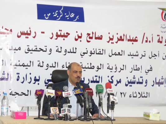 جاء ذلك لدى مشاركة رئيس الوزراء اليوم في فعالية إشهار وتدشين مركز التدريب القانوني لوزارة الشؤون القانونية تحت شعار “من أجل ترشيد العمل القانوني للدولة وتحقيق مبدأ سيادة القانون في إطار الرؤية الوطنية لبناء الدولة اليمنية الحديثة “.
