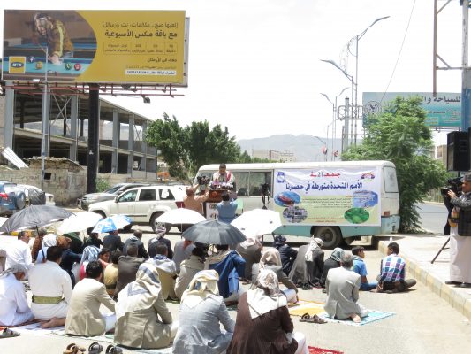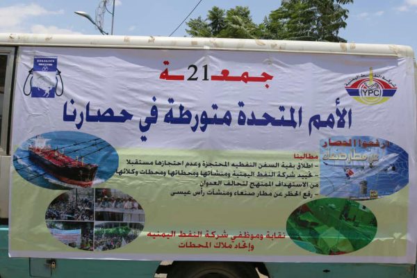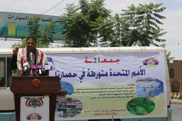 وخلال الوقفة الاحتجاجية عقب صلاة الجمعة ال 21 بعنوان ( الامم المتحدة متورطة في حصارنا ) اكد الناطق الرسمي لشركة النفط اليمنية نائب المدير التجاري الأستاذ / أمين الشباطي تورط الامم المتحدة في حصار الشعب اليمني بتغاضيها عن ممارسات تحالف العدوان التعسفية المستمرة بحجز السفن النفطية وعرقلة وصولها الى ميناء الحديدة .