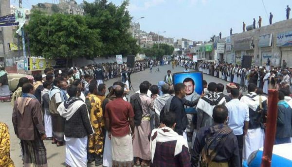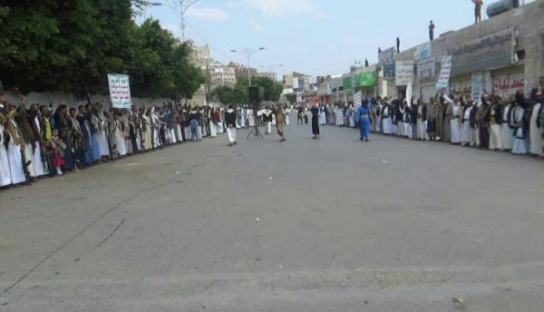 وقفة احتجاجية لأبناء مدينة حجة رفضا واستنكارا لجريمة العدوان بحق الأسرى في ذمار
