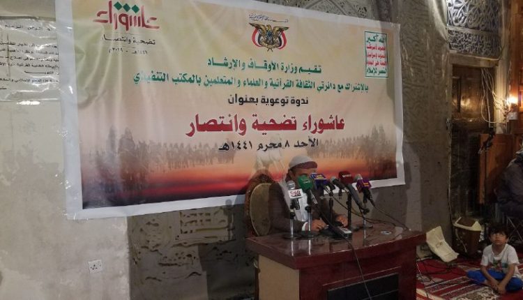 نظمت وزارة الاوقاف والارشاد بالتعاون مع دائرتي الثقافة القرآنية والعلماء والمتعلمين بالمكتب التنفيذي مساء اليوم بالجامع الكبير بصنعاء ندوة بعنوان “عاشوراء تضحية وإنتصار”.