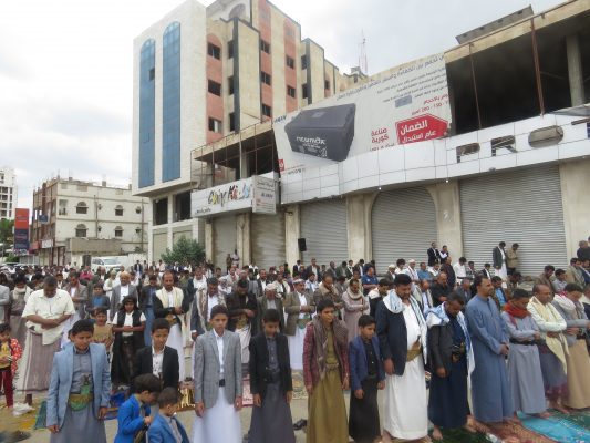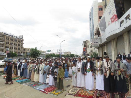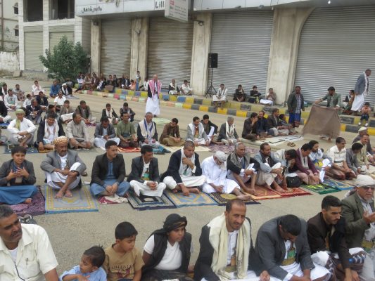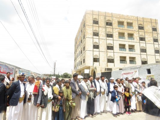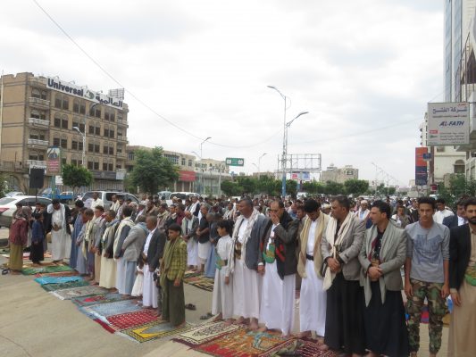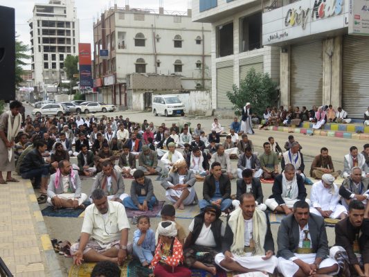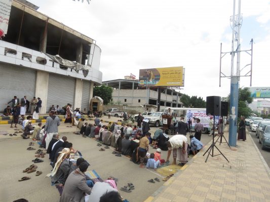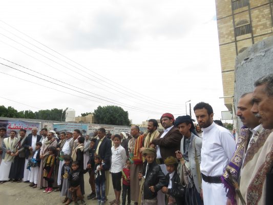 نظم موظفو شركة النفط اليمنية والنقابات والهيئات التابعة لها اليوم وقفة احتجاجية عقب صلاة الجمعة ال23 التي حملت عنوان (استمرار حجز السفن النفطية وصمة عار في حبين الامم المتحدة ) امام مكتب الامم المتحدة في صنعاء .