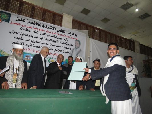 الفعالية التكريمية أقيمت تحت عنوان “دماء الشهداء نار تحرق عروش الظالمين ونور يضيء درب المجاهدين”، وتزامنت مع الذكرى الخامسة لثورة الحادي والعشرين من سبتمبر التي أتت تثمينا لتضحيات اسر الشهداء وصورة إجلال لبطولات الشهداء في مقارعة الأعداء.