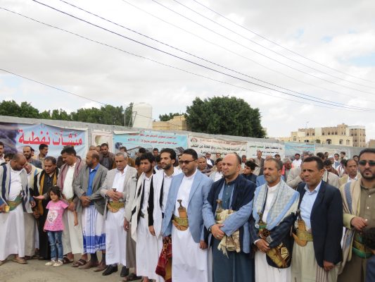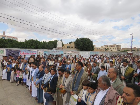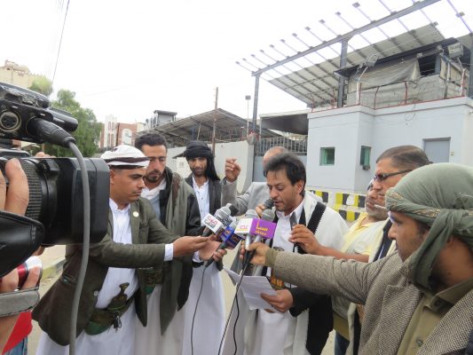 المحتجون استنكروا في البيان الصادر عن الوقفة صمت الامم المتحدة ووقوفها عاجزة حيال الاجراءات التعسفية التي يمارسها تحالف العدوان واستمراره في احتجاز السفن النفطية رغم حصولها على التصاريح اللازمة من الامم المتحدة .