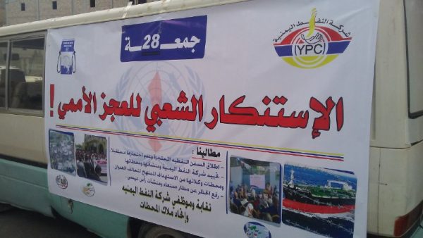 وخلال الوقفة الاحتجاجية التي حملت عنوان “الاستنكار الشعبي للعجز الاممي ” والتي حضرها المدير التنفيذي لشركة النفط اليمنية ياسر الواحدي وقيادات الشركة أكد الناطق الرسمي لشركة النفط اليمنية – مدير دائرة التوكيلات والنقل والتأمين أمين الشباطي وصول السفينتين عمير وانفرينو المحملتان بعشرين الف طن من مادة الديزل بالإضافة الى سفينة اخرى تحمل مادة المازوت المخصصة لكهرباء مدينة الحديدة .