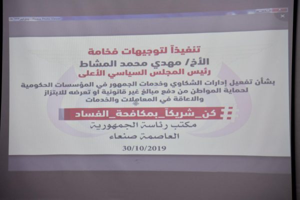 كما وجه الرئيس المشاط بتخصيصِ إدارةٍ معنيةٍ بالشكاوى بمكتب رئاسة الجمهورية مع أرقامٍ مجانية وطاقمٍ مختصٍ في حال لم تتفاعلْ الجهةُ المعنيةُ مع شكوى المواطن وستستقبلُ الإدارة المختصةُ بمكتب رئاسة الجمهورية الشكاوى وتتابعُها حتى تحل وستحظى باهتمامٍ ومتابعةٍ مباشرةٍ من قبلنا.