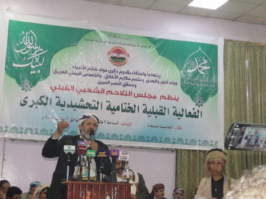 وحث القبائل إلى الحضور المشرف والمشاركة الواسعة في الفعالية المركزية بذكرى المولد النبوي والتي ستقام عصر غد السبت ورفد الجبهات بالمال والرجال حتى تحقيق النصر.