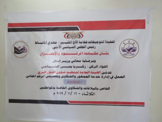 وأوضح الوادعي أن الهيئة عملت على تفعيل الرقم المجاني 8000007 بما يعزز من الشفافية والمصداقية بين الهيئة والمواطنين وتنفيذا لتوجيهات رئيس المجلس السياسي الأعلى لمكافحة الفساد المالي والإداري، وتسهيل انجاز معاملات المواطنين .. مبينا أنه تم تفعيل الموقع الالكتروني لاستقبال ومتابعة المعاملات الكترونيا، وتوفير دليل ولائحة توضح طبيعة خدمات الجمهور والمعاملات المنجزة وقيد الإنجاز.