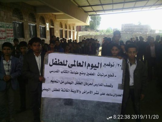 و أحيت مجمعات ومدارس مديرية مغرب عنس فعاليات متنوعه بمناسبة اليوم العالمي للطفل بفقرات متنوعه مسرحيه وانشاديه ووقفات تخللتها الكلمات التي عبرت في مجملها عن مايتعرض له اطفال اليمن من قصف و قتل من قبل طيران العدوان في ضل صمت اممي مطبق إلى جانب الحصار الاقتصادي المفروض على بلادنا ومنع دخول الادويه والاغذيه فمن لايموت بالطيران يموت جوعا ومرضا من الاوبئة المنتشره , هذا وقد طالب المحتجون بأسم اطفال اليمن المنظمات المحليه والدوليه بالضغط على دول العدوان بوقف العدوان السعودي الامريكي ورفع الحصار والسماح بدخول الادويه والاغذيه