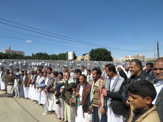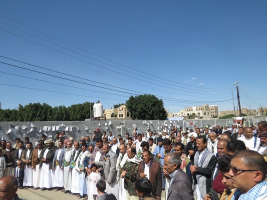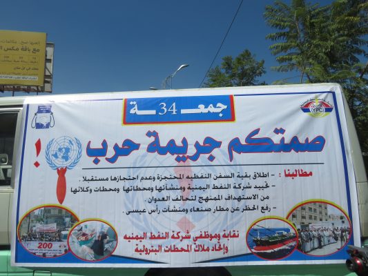 نظم موظفو شركة النفط اليمنية والنقابات والهيئات التابعة لها اليوم وقفة احتجاجية امام مكتب الامم المتحدة بصنعاء عقب صلاة الجمعة ال” 34 ” والتي حملت عنوان ” صمتكم جريمة حرب ” .