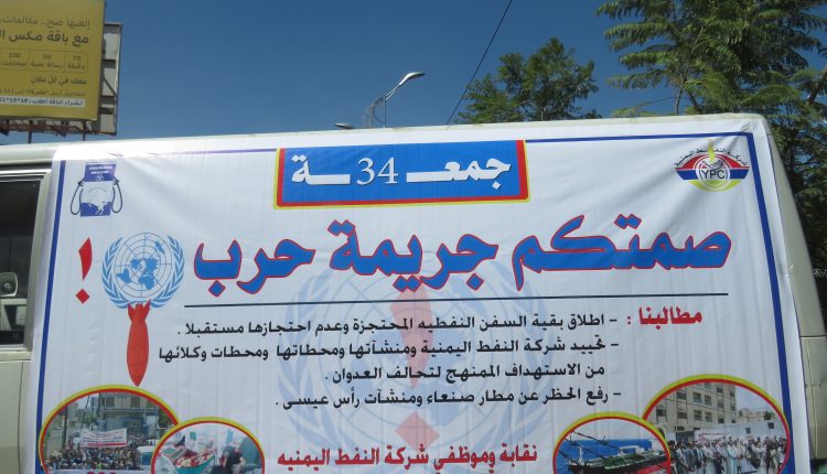 نظم موظفو شركة النفط اليمنية والنقابات والهيئات التابعة لها اليوم وقفة احتجاجية امام مكتب الامم المتحدة بصنعاء عقب صلاة الجمعة ال” 34 ” والتي حملت عنوان ” صمتكم جريمة حرب ” .