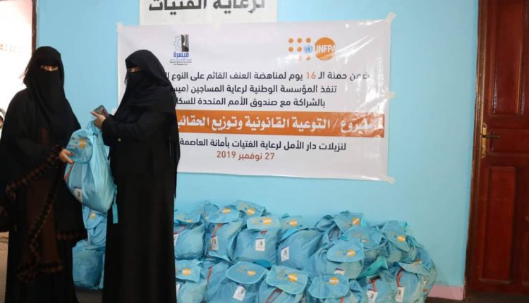 دشنت مؤسسة ميسرة الوطنية لرعاية المساجين مشروع التوعية القانونية وتوزيع 500 حقيبة المستلزمات النسائية لنزيلات دار الامل لرعاية الفتيات وقسم النساء في الإصلاحيات المركزية في أمانة العاصمة ومحافظات عمران، صعدة، حجة، المحويت، ذمار، إب، الحديدة، البيضاء – رداع ضمن حملة الـ 16 يوم لمناهضة العنف بالتعاون مع صندوق الأمم المتحدة للسكان.