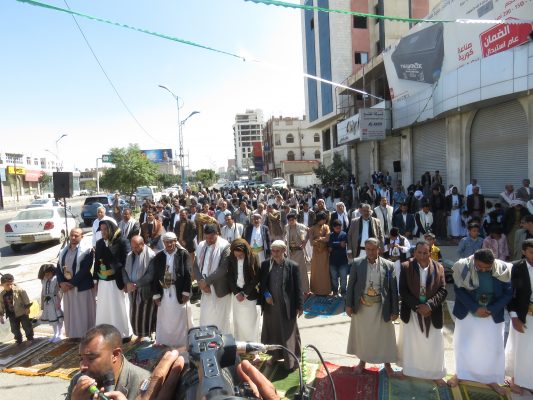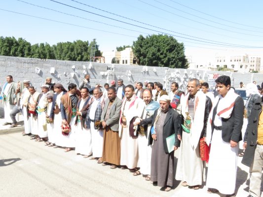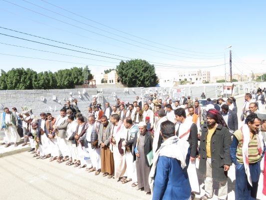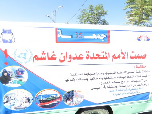 نظم موظفو شركة النفط اليمنية والنقابات والهيئات التابعة لها اليوم عقب صلاة الجمعة الـ 35 وقفة احتجاجية أمام مكتب الأمم المتحدة بصنعاء بعنوان ” صمت الامم المتحدة عدوان غاشم “.