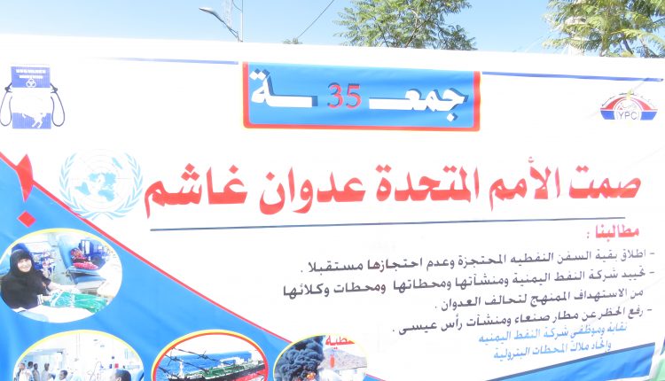 نظم موظفو شركة النفط اليمنية والنقابات والهيئات التابعة لها اليوم عقب صلاة الجمعة الـ 35 وقفة احتجاجية أمام مكتب الأمم المتحدة بصنعاء بعنوان ” صمت الامم المتحدة عدوان غاشم “.