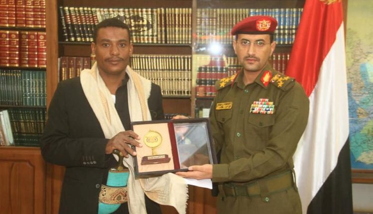 كرم مدير دائرة التوجيه المعنوي .المتحدث الرسمي للقوات المسلحة العميد يحيى سريع ،اليوم الأحد، بصنعاء الرسام سيف الرازحي بدرع دائرة التوجيه المعنوي تقديراَ لإسهامه في رسم العديد من اللوحات الفنية التي أبرزت النجاح الكبير في الصناعات العسكرية.