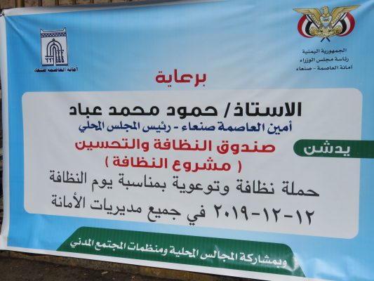 دشن نائب رئيس الوزراء محمود الجنيد وأمين العاصمة حمود عُباد، اليوم حملة النظافة 12 /12 بكافة مديريات أمانة العاصمة،التي ينفذها صندوق ومشروع النظافة بالأمانة.