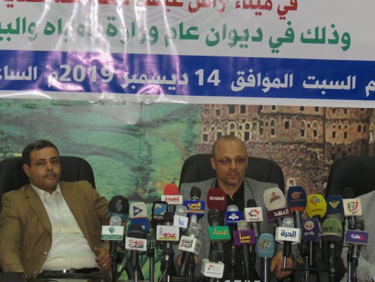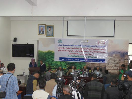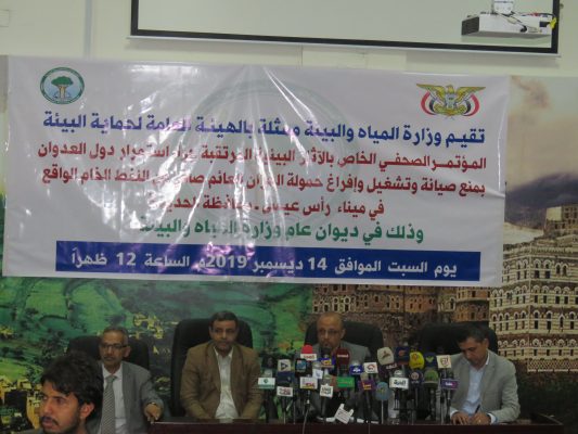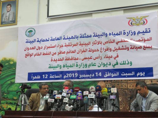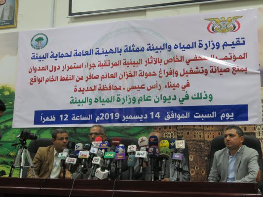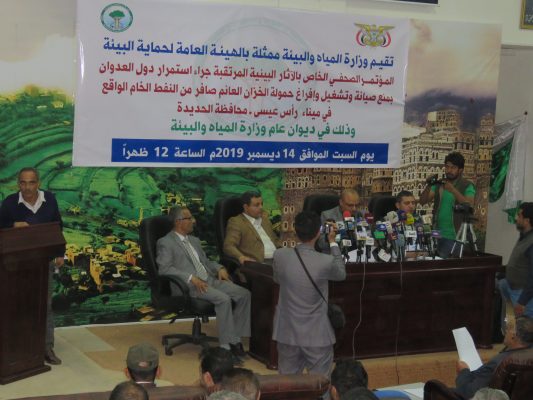 بالصــور : مؤتمر صحفي لوزارة المياه والبيئة تحذر من أسوأ كارثة بيئية نتيجة منع العدوان إفراغ حمولة السفينة صافر