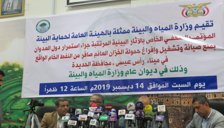 بالصــور : مؤتمر صحفي لوزارة المياه والبيئة تحذر من أسوأ كارثة بيئية نتيجة منع العدوان إفراغ حمولة السفينة صافر