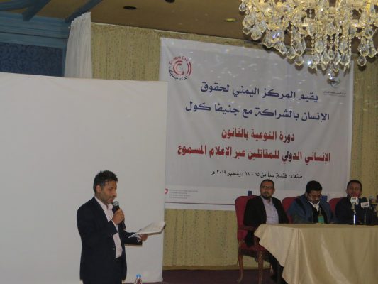 أختتمت بصنعاء اليوم دورة التوعية بالقانون الانساني الدولي للمقاتلين عبر الاعلام المسموع والتي اقامها المركز اليمني لحقوق الانسان بالشراكة مع جنيفا كول , وقد استمرت الدورة اربعة ايام شاركت فيها 10 اذاعات من مختلف المحافظات حيث كان يمثل الاذاعة اثنين من كوادرها