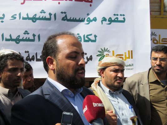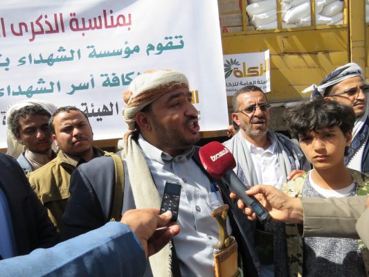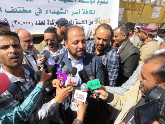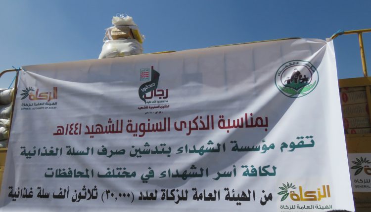 وقال “نتشرف اليوم في الهيئة العامة للزكاة بالتعاون مع مؤسسة الشهداء بتقديم 30 ألف سلة غذائية لأسر الشهداء في عموم المحافظات بمناسبة الذكرى السنوية للشهيد “.