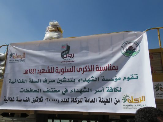 دشنت الهيئة العامة للزكاة اليوم، مشروع توزيع 30 ألف سلة غذائية على أسر الشهداء في مختلف محافظات الجمهورية بالتعاون والتنسيق مع مؤسسة الشهداء بمناسبة الذكرى السنوية للشهيد.