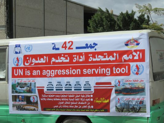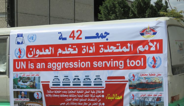 وفي الوقفة الاحتجاجية التي نظمت عقب صلاة الجمعة الـ” 42″ بعنوان ” الامم المتحدة أداة تخدم العدوان ” أكد الناطق الرسمي لشركة النفط اليمنية امين الشباطي ان تحالف العدوان مازال يحتجز خمس سفن نفطية محملة بأكثر من مائة وخمسة عشر الف طن من المواد البترولية في عرض البحر بالرغم من حصولها على تصاريح الامم المتحدة إمعاناً منه في تضييق الخناق على المواطن اليمني .