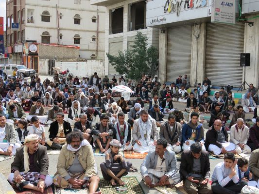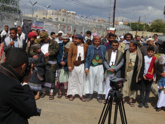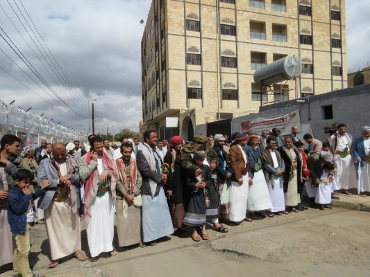 فيما أكد البيان الصادر عن الوقفة إستمرار المعتصمين في إعتصامهم المفتوح امام مكتب الامم المتحدة بصنعاء حتى يتم إطلاق كافة السفن النفطية المحتجزة وتلبية مطالبهم المحقة والمشروعة .