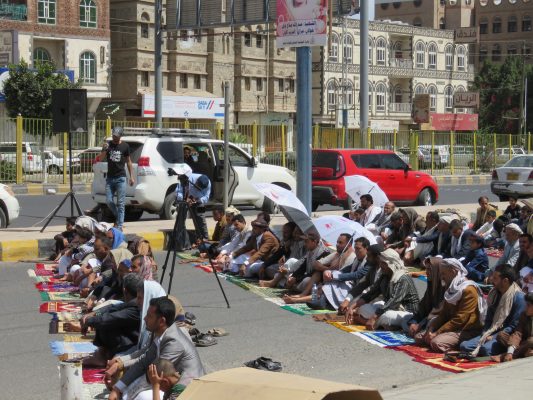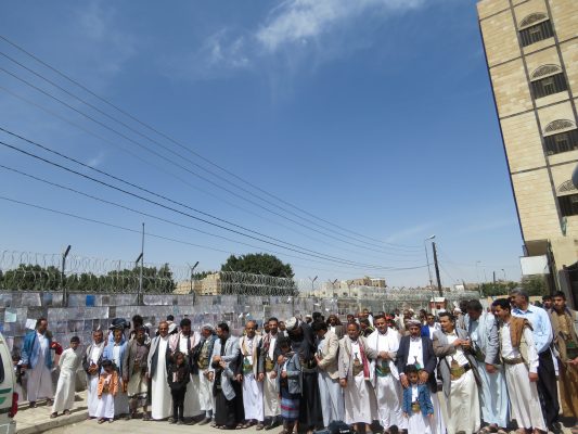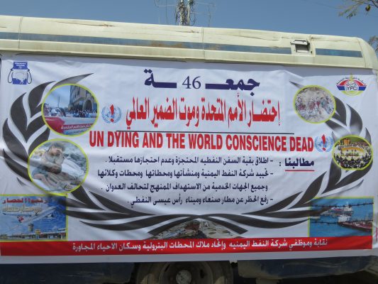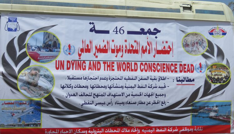نظم موظفو شركة النفط اليمنية ، ونقاباتها وهيئاتها اليوم وقفة إحتجاجية امام مكتب الامم المتحدة بصنعاء ، عقب صلاة الجمعة الـ ” 46 ” بعنوان “إحتضار الامم المتحدة وموت الضمير العالمي ” .