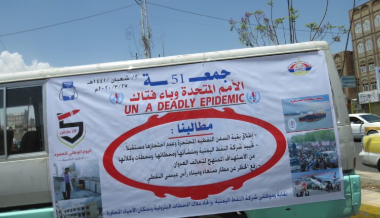 نظم موظفو شركة النفط اليمنية والنقابات والهيئات التابعة لها ، وجمع غفير من المواطنين،  اليوم وقفة إحتجاجية ، أمام مكتب الامم المتحدة بصنعاء عقب صلاة الجمعة الـ “51 ” بعنوان ” الامم المتحدة وباء فتاك ” .