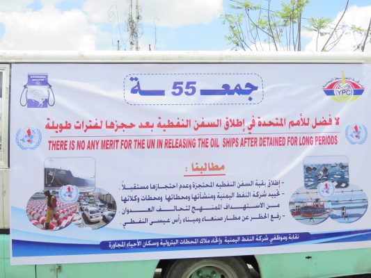 نظم موظفو شركة النفط اليمنية والنقابات والهيئات التابعة لها اليوم وقفة إحتجاجية أمام مكتب الامم المتحدة بصنعاء عقب صلاة الجمعة الـ ” 55 ” بعنوان ” لا فضل للأمم المتحدة في إطلاق السفن النفطية بعد حجزها لفترات طويلة .