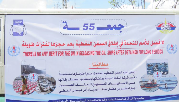 نظم موظفو شركة النفط اليمنية والنقابات والهيئات التابعة لها اليوم وقفة إحتجاجية أمام مكتب الامم المتحدة بصنعاء عقب صلاة الجمعة الـ ” 55 ” بعنوان ” لا فضل للأمم المتحدة في إطلاق السفن النفطية بعد حجزها لفترات طويلة .
