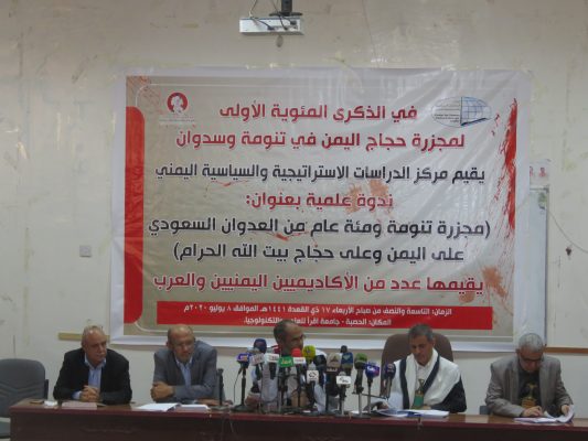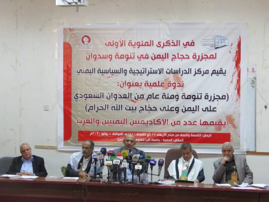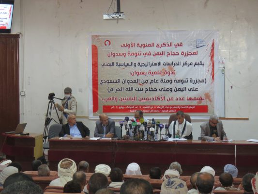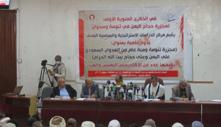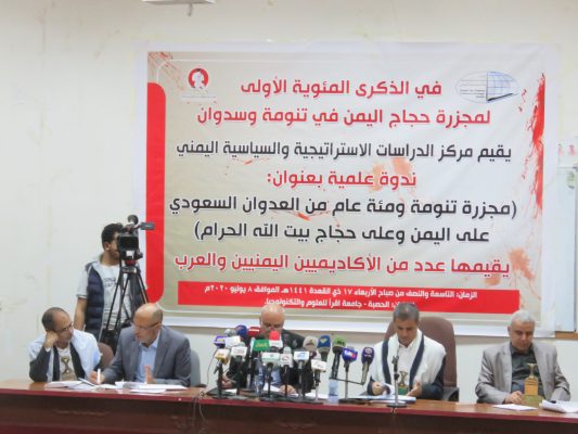 عٌقدت بصنعاء اليوم ندوة علمية بعنوان ” مجزرة تنومة ومائة عام من العدوان السعودي على اليمن وعلى حجاج بيت الله الحرام”، نظمها مركز الدراسات السياسية والاستراتيجية اليمني.