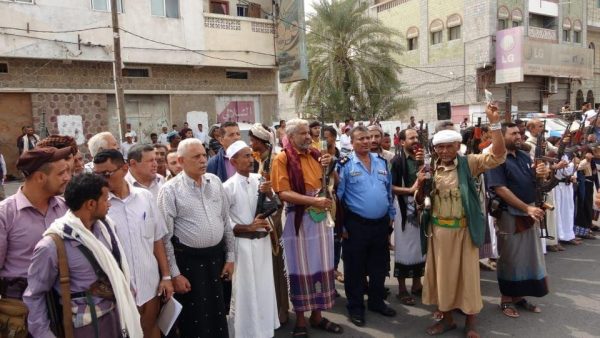 وفي الوقفة الاحتجاجية الحاشدة التي نظمتها السلطة المحلية والمكتب الإشرافي وحضرها القائم بأعمال المحافظ محمد عياش قحيم ووكيلا المحافظة أحمد مهدي البشري وعلي الكباري ومدراء المكاتب التنفيذية والخدمية والمشرفين وعدد من الفعاليات السياسية والحزبية والاجتماعية ووجاهات قبلية وقيادات منظمات مجتمع مدني ألقى القائم بأعمال المحافظ كلمة عبر فيها عن استنكار أبناء المحافظة وتنديدهم الشديدين لاستمرار الصمت المريب للأمم المتحدة وعدم مبالاتها بمعاناة الشعب اليمني ومطالبه المشروعة.