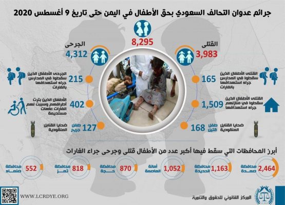 وفي هذا الصدد، أصدر المركز القانوني للحقوق والتنمية إحصائية لجرائم التحالف العدوان الأمريكي السعودي الاماراتي بحق الأطفال في اليمن حتى تاريخ 9 أغسطس 2020م، ويبين المركز أن إجمالي عدد الضحايا من الأطفال بلغ 8.295، منهم 3.983 شهداء، و4.312 جرحى.